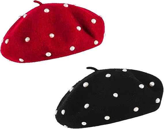 2 Pcs Winter Wool Berets Pearl French Style Beanie Cap Solid Color Winter Hat Beaded Beret Cap for Women and Girls Casual Use